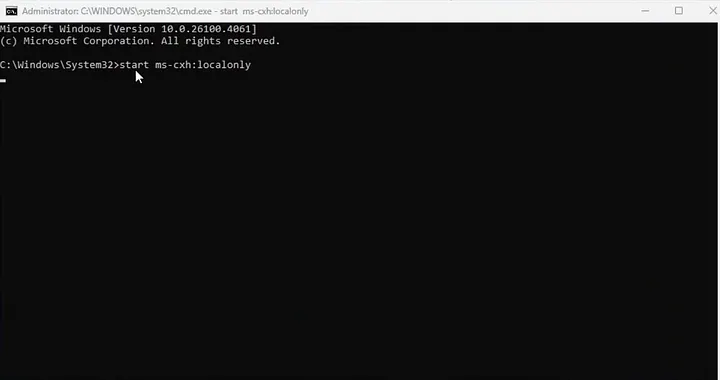 In the Command Prompt, type the following command exactly and then press Enter: start ms-cxh:localonly