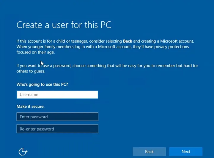 In the “Create a user for this PC” screen that appeared, type the username you want for your local account. If you’d like a password for this account (highly recommended for security), enter a memorable password and confirm it. (If you prefer no password, you can leave the fields blank — Windows will allow a blank password, though this is not advisable for most users.)